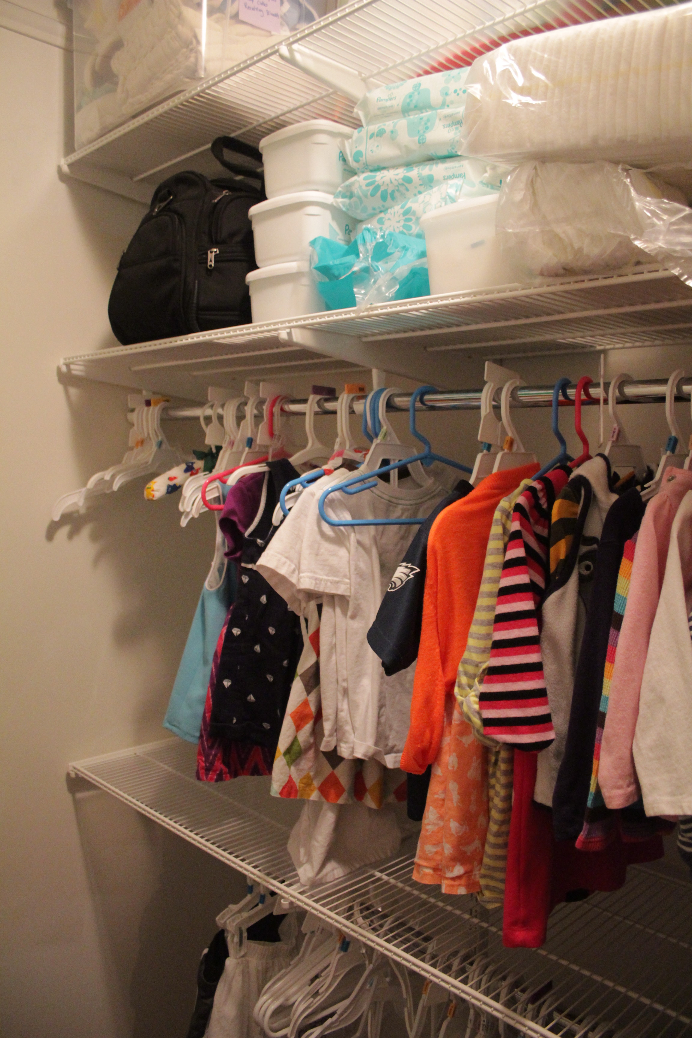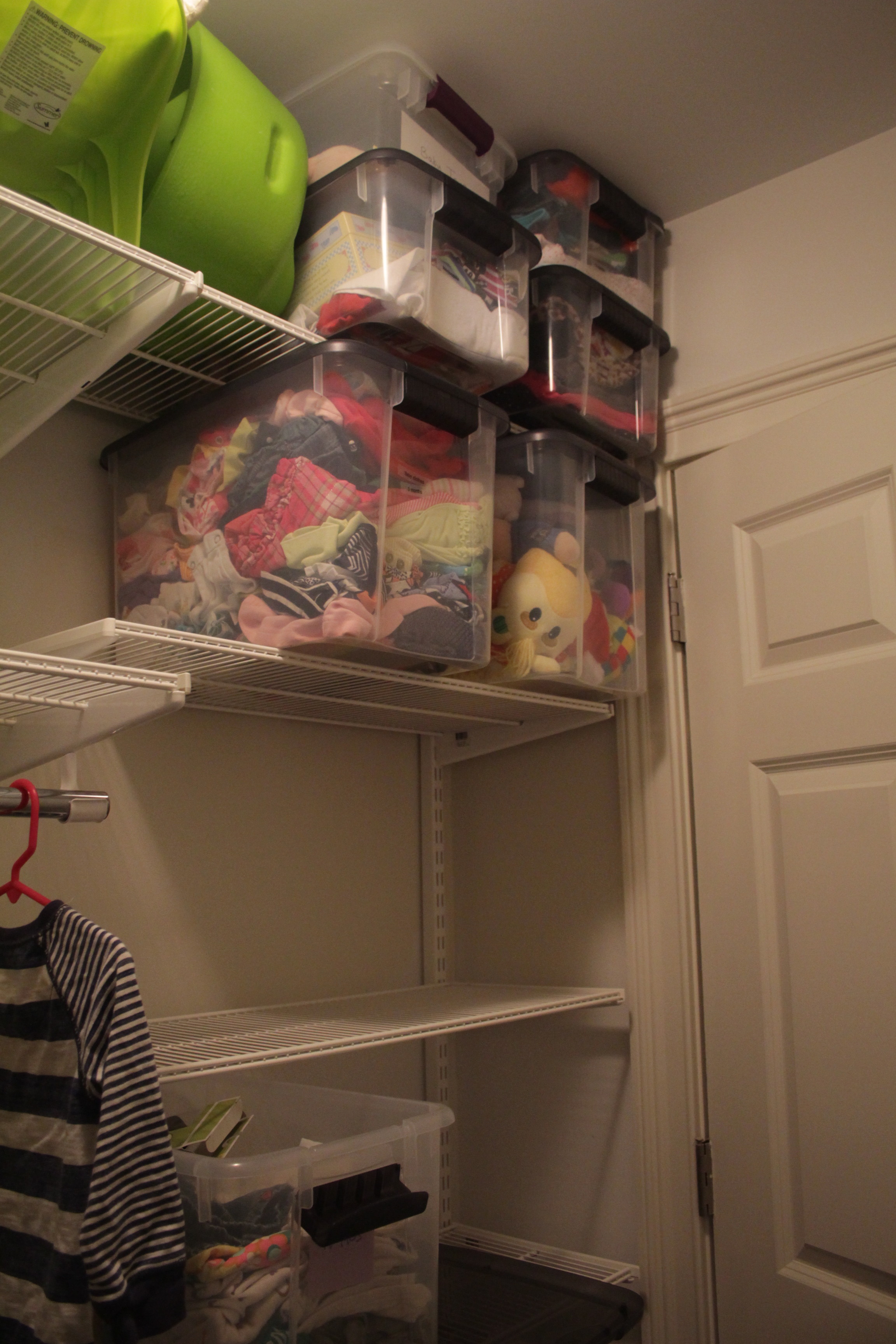 As I put everything back in the closet I started culling stuff that was too small. I am a bit ashamed to admit that some of the stuff hanging up had been in the 9-12 month sizes (she’s two and a half now). When all was said and done she had about half as many hanging clothes and an entire additional storage bin full of too small stuff.