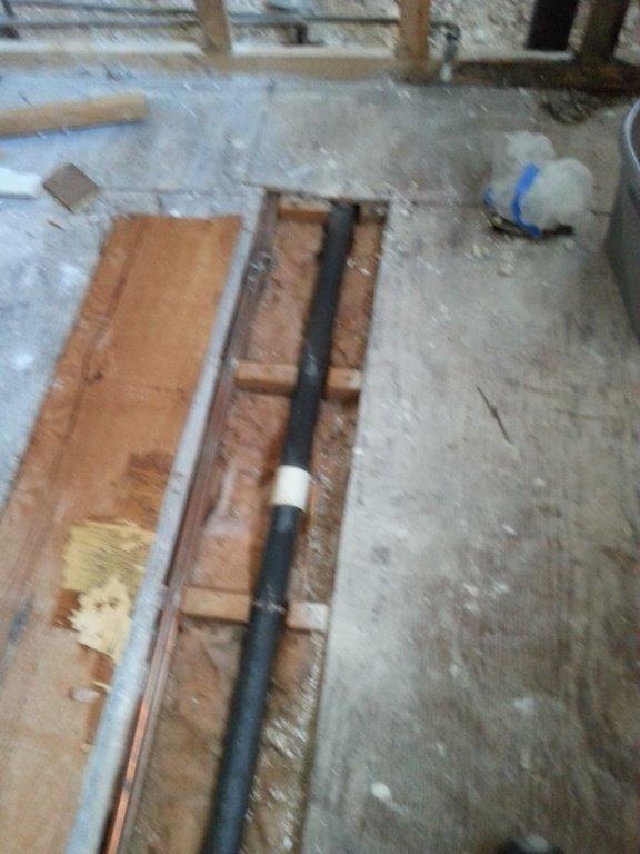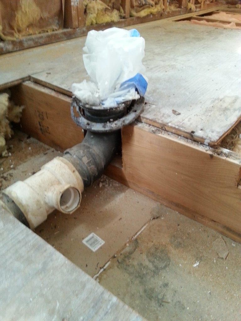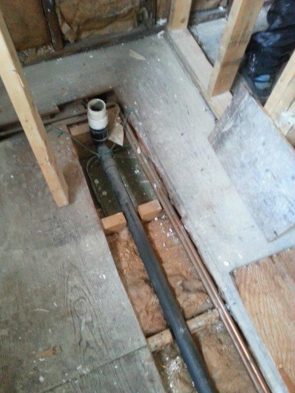 Rather than cut holes through the joists, which would have required some basic skills, the original owner just notched them to make room for the drain lines. Which was especially impresive in the case of the toilet drain (far right), which was left with barely 2″ of material. It is amazing no one ever fell through.